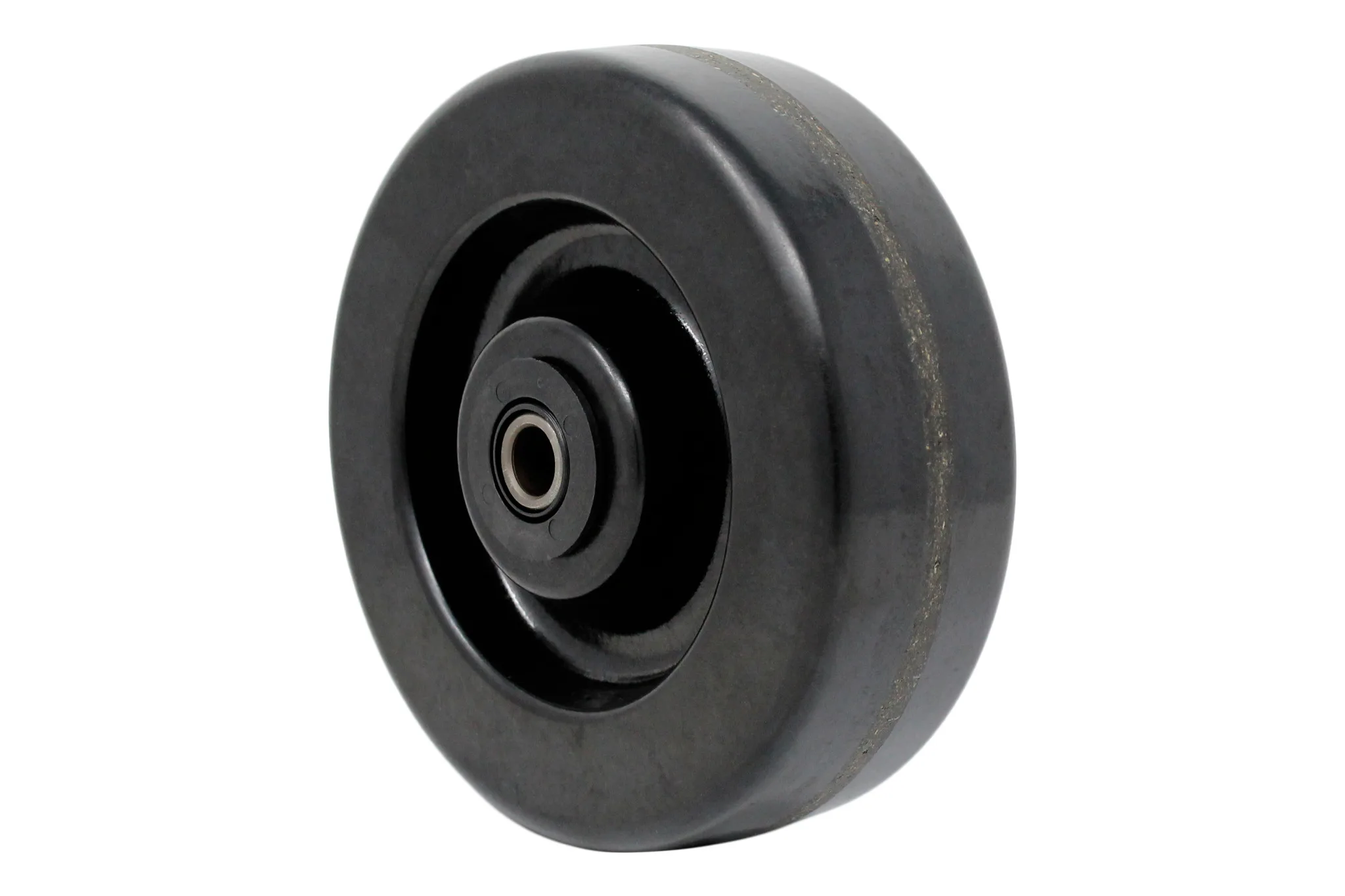 Our Phenolic Caster Wheels, made from macerated canvas mixed with phenolic resin and molded under high pressure and temperature are a cost-effective, hard-composition, non-marking solution ideal for supporting heavy stationary loads that move infrequently. With a hardness comparable to polished maple flooring and a Durometer of Shore D 90, these wheels are designed to handle large loads comparable to metal wheels without developing flat spots, even when parked for prolonged periods under load. Available in diameters from 3” to 18” and widths from 1-¼” to 4”, they come standard with roller bearings or optional precision sealed ball bearings, making them perfect for smooth concrete surfaces in industrial settings like warehouses or manufacturing facilities.