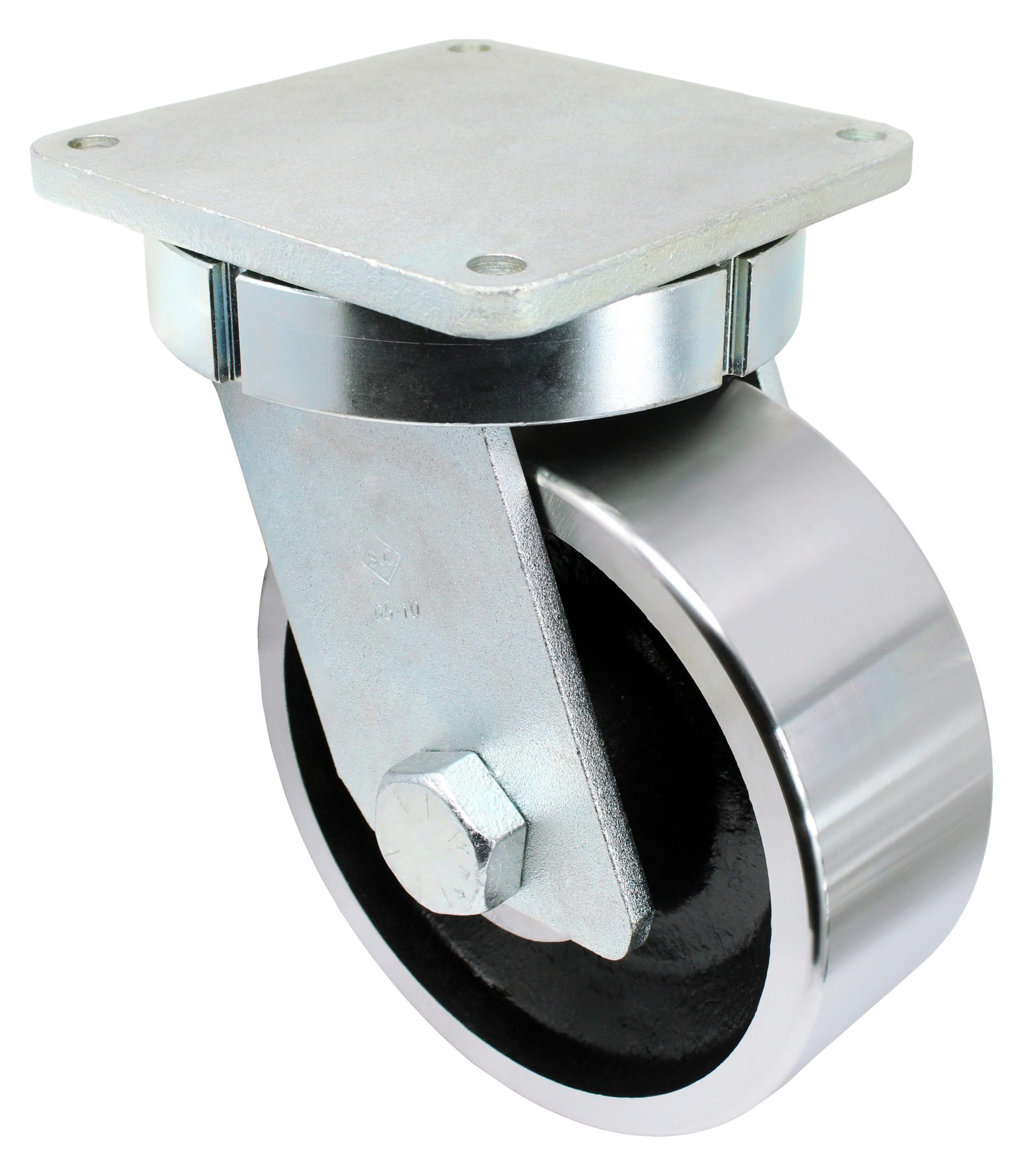 Capacity 20,000 pounds per caster under ideal operating conditions. Load ratings are based on manually moved loads at a speed up to 3 mph under ideal operating conditions. If your application involves abuse please contact us for a recommendation. Consult us for a capacity rating based on your application if these casters are to be used with mechanically powered equipment. This caster uses 4 inch wide wheels that are 8, 10, or 12 inches in diameter.