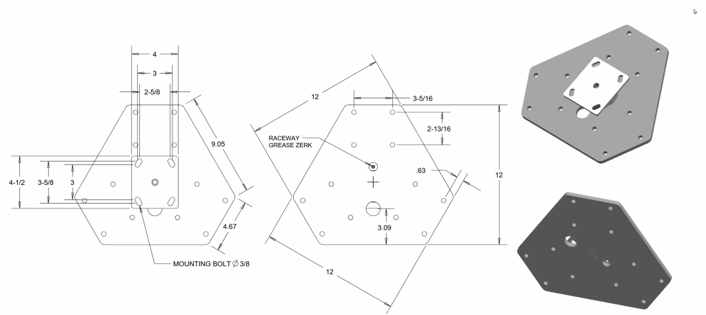 It has two mounting plates, one above and one below the swivel, with ball bearings for easy rotation, plus a lubrication fitting and zinc-plated finish to resist rust.