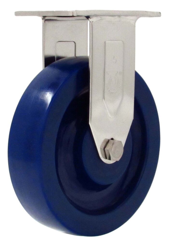 The APH – Solid All Polyurethane Heavy Duty Wheel for the Plate Caster SS-3A is a total locking stainless steel caster wheel designed for sanitary and washdown applications in settings like pharmaceutical labs hospitals and food processing plants with a blue solid polyurethane tread locked to a polyolefin core for enhanced strength and stability. Available in diameters of 3” 4” and 5” with a 1-¼” tread width this wheel supports up to 350 lbs per caster matching the bracket’s limit—an exception for the SS-3A emphasizing its heavy-duty nature for a light-duty stainless swivel caster—and operates from -50°F to 180°F with a 65D Shore durometer making it perfect for clean environments indoors or outdoors. It features sealed ball bearings delrin bearings or stainless steel sealed ball bearings for smooth quiet rolling in industries requiring corrosion resistance.