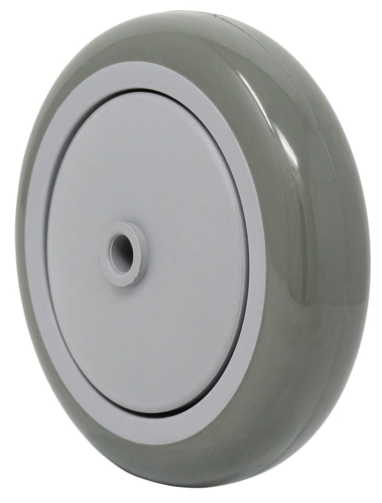 This injection-molded Polyurethane wheel can come in 4 different colors : red, gray, black, blue. The polyurethane tires are mechanically bonded to a polyolefin center. The wheel’s design features precision sealed ball bearings, and has a durometer of Shore 60D. We recommend these wheels for use above 32F and below 180F. They have injection molded polyurethane tires which are best for use on smooth floors. Avoid use in applications where this is abuse such as shock loads, impact, or floor obstructions, or static (standing) loads. Do not exceed 50% of the rated capacity of the wheel for applications that are parked for prolonged periods.