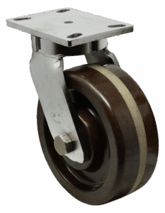 This caster has a broad selection of 2″ wide wheels that are NSF and ROHS compliant, including polyolefin (like PB), gray soft rubber, neoprene, polyurethane varieties, nylon, phenolic, high-temp options, V-groove, water-resistant polyurethane, and solid stainless steel. Diameters from 4″ to 8″.