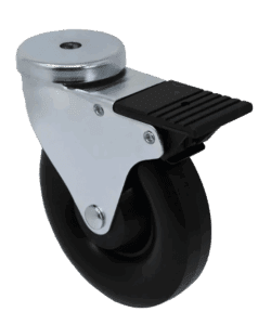 Yes, the Model 9 total lock stainless caster offers a TL – Total Locking Brake option, with the pedal behind the wheel to lock both swivel and wheel rotation. It’s not for holding on inclines, but great for securing in wet or corrosive setups.