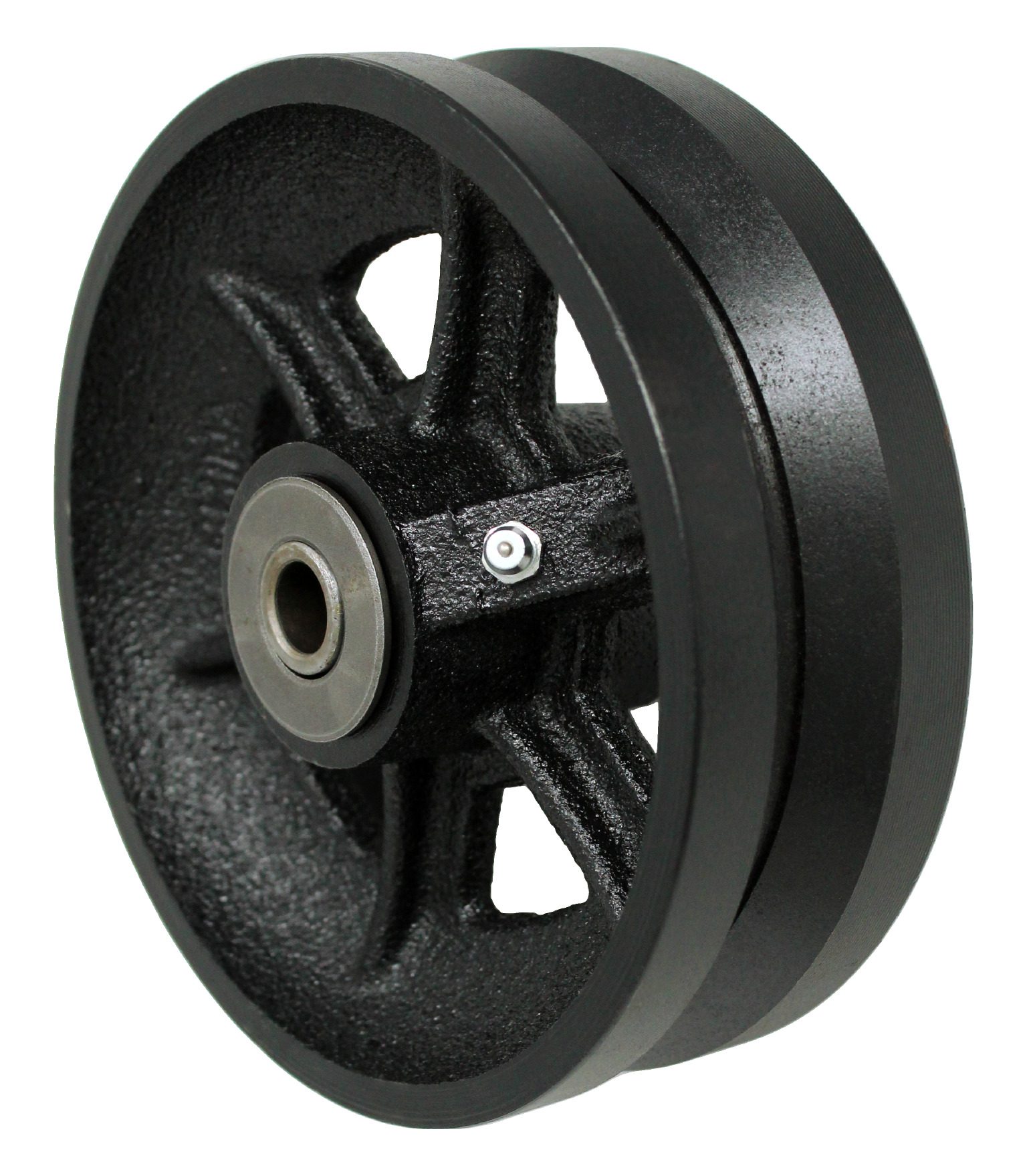The VL Gray Iron V-Groove Wheel in the Model 9 industrial plate caster is made from gray iron, a cost-effective material with low ductile strength, suitable for light-duty applications without abuse.