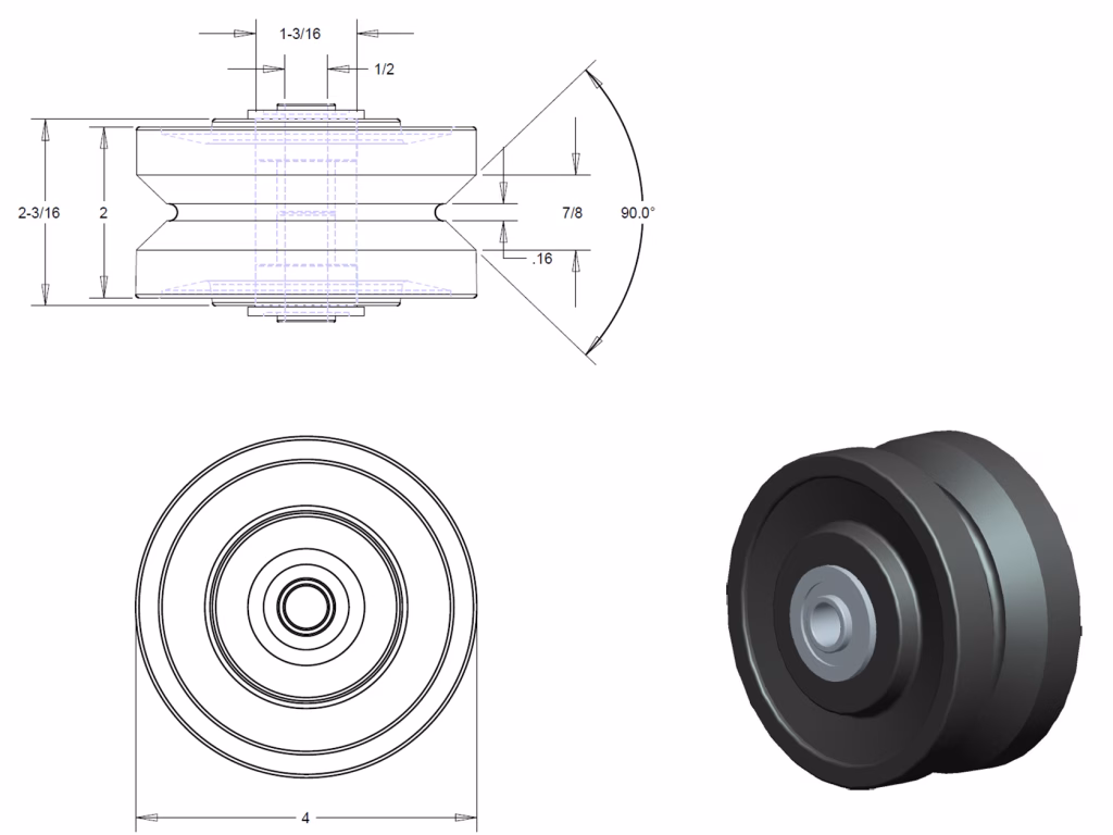 How do the V-groove dimensions affect performance? The 7/16″ deep, 7/8″ wide V-groove securely engages angle iron or round bar tracks, preventing derailment and ensuring precise tracking under loads up to 1,500–2,000 lbs. The flat treads balance weight distribution, reducing wear and enabling stable rolling on tracks or smooth floors.