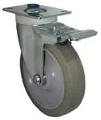 The total lock brake on the Model 3A plate mount caster with RH High Capacity Soft Gray Rubber Wheels locks the swivel and the wheel, completely immobilizing the stamped steel assembly to prevent the object—like a cart, table, or workbench—from moving when someone leans against it while cutting, welding, or butchering, ensuring safety during such tasks.