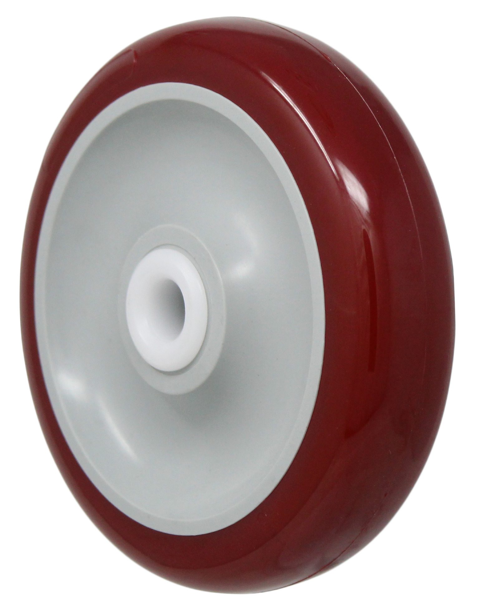 The Premium Maroon Polyurethane Wheel (PM) features a polyurethane tire mechanically locked to a polyolefin core, with dual-row annular ball bearings for superior rollability and a 350 lbs capacity. Its Shore 60D durometer ensures durability for institutional settings like hospitals, labs, or food service, though flat spots may occur under prolonged heavy loads.