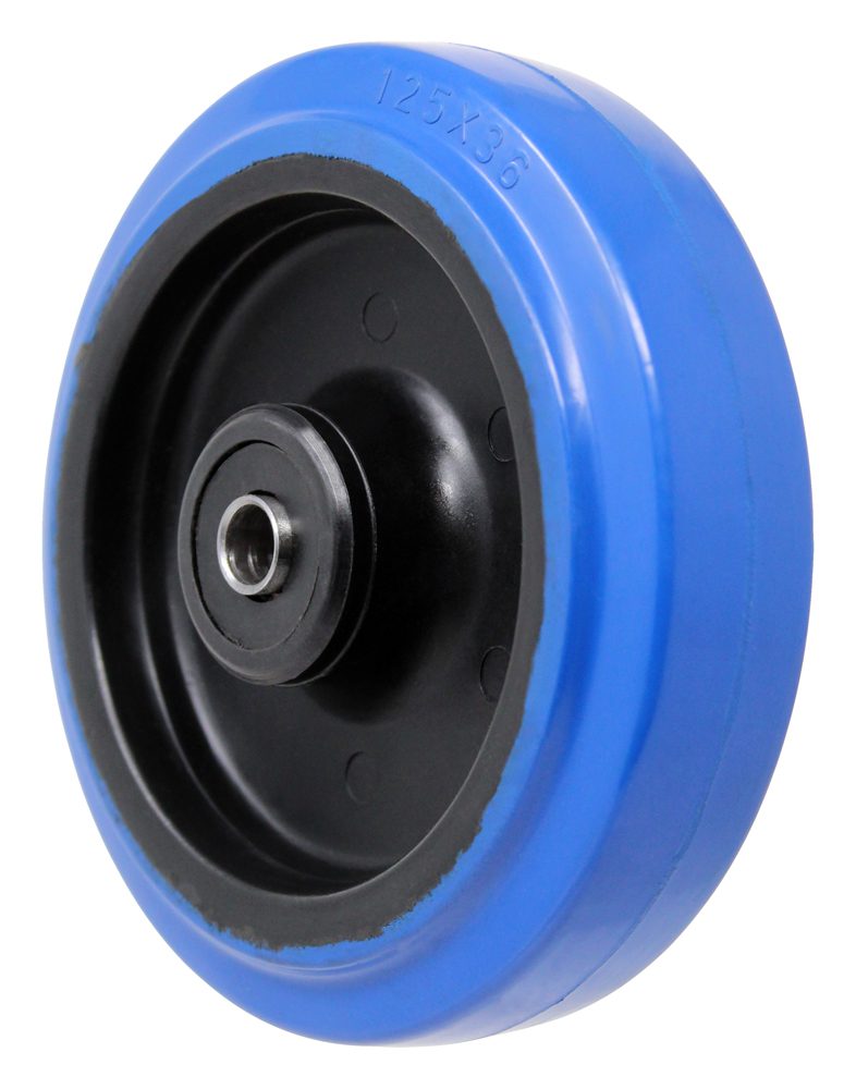 The blue tire (tread) on the Road Case Caster wheel is a flexible elastomer. What makes this elastomer special is its ability to bounce. Resilience in a wheel material is a necessary feature in order to protect the cargo being moved. The tire on this wheel is a resilient synthetic elastic rubber. It provides the performance of a cushion ride without the expense associated with a tire made using natural rubber. The tire is chemically bonded to a heavy duty impact resistant industrial grade polyolefin core (center).