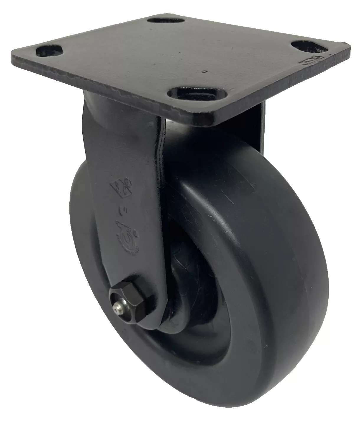 The PB Wheel’s one-piece, injection-molded polyolefin resists water and mild chemicals, ensuring hygiene and durability for heavy duty industrial casters in wet settings like food processing plants or labs, with no bond failure risk. Rigid casters enhance stability for plate casters like Model 9, supporting heavy loads with controlled movement in sanitary environments.