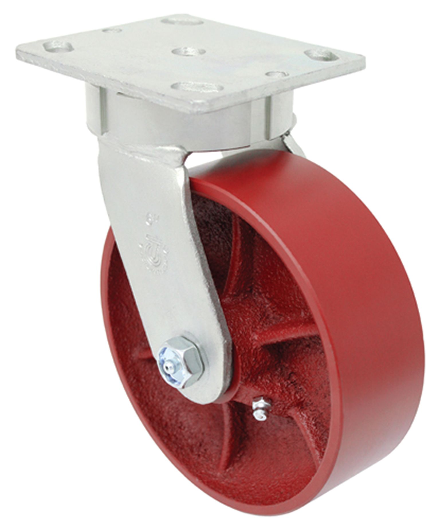 This kingpinless caster is designed for industrial environments like manufacturing, warehousing, food processing, pharmaceuticals, hospitals, and automotive plants, handling heavy loads on smooth floors with manual or powered movement. It’s ideal for carts in wet, corrosive, or washdown areas (stainless version) and reduces vibration for sensitive equipment. The larger swivel radius option for 6” and 8” wheels eases direction changes on ramps or long distances.