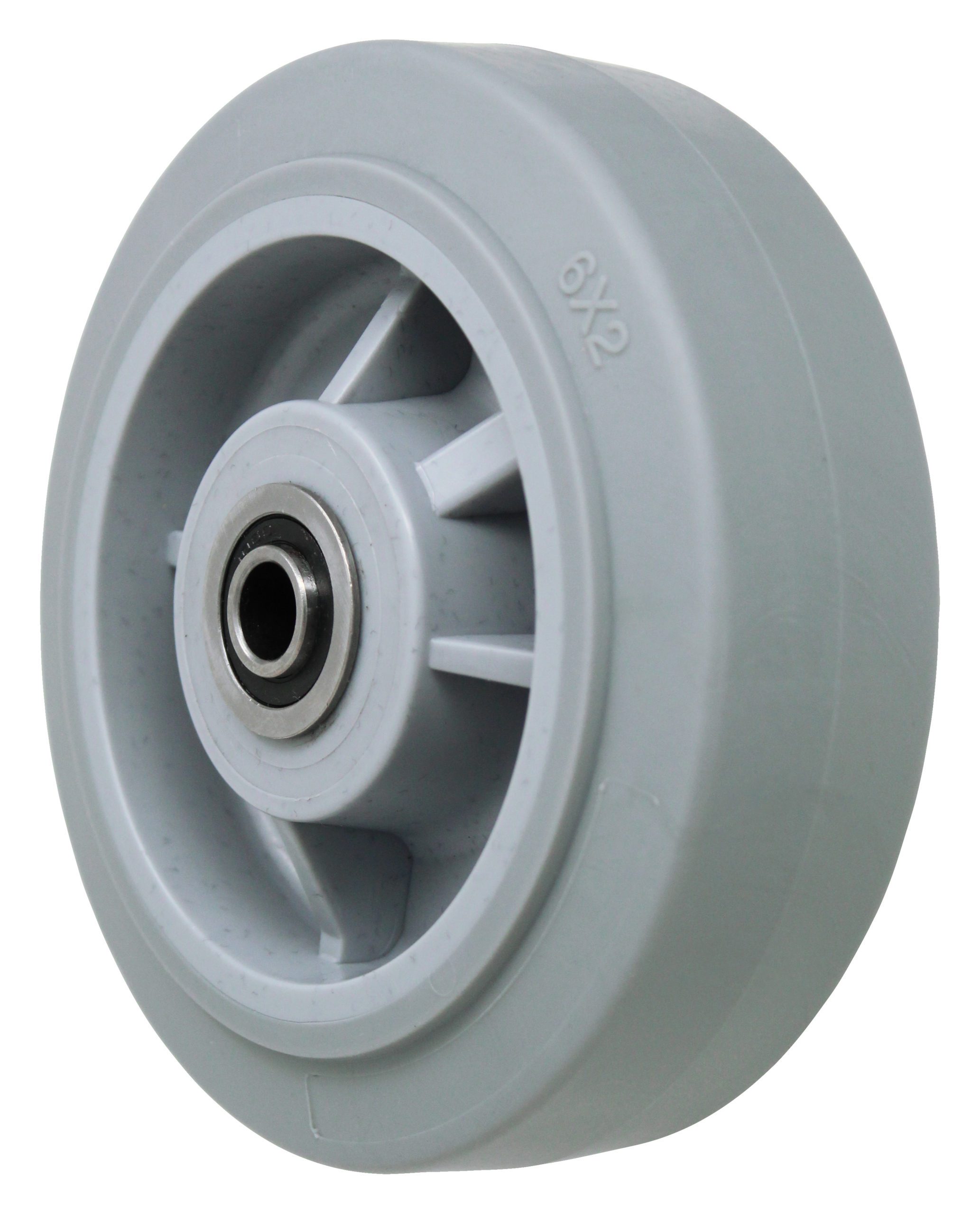 The RH High Capacity Soft Gray Rubber Wheel in the Industrial Plate Caster Model 9 is a non-marking injection-molded thermoplastic rubber tire chemically bonded to a polyolefin center, offering a quiet, shock-absorbing ride that protects floors and rolls over small debris, with a 65A durometer and a temperature range of -20°F to 180°F, though I don’t recommend using it below 32°F. This high capacity soft gray rubber caster wheel, available in 4”, 5”, 6”, and 8” diameters, all 2” wide, supports up to 700 lbs in the 8×2 size, comes with annular ball bearings, roller bearings, or delrin bearings, and resists many chemicals and solvents, making it a top pick for casters and wheels in pharmaceutical labs, hospitals, food service, and institutional settings.