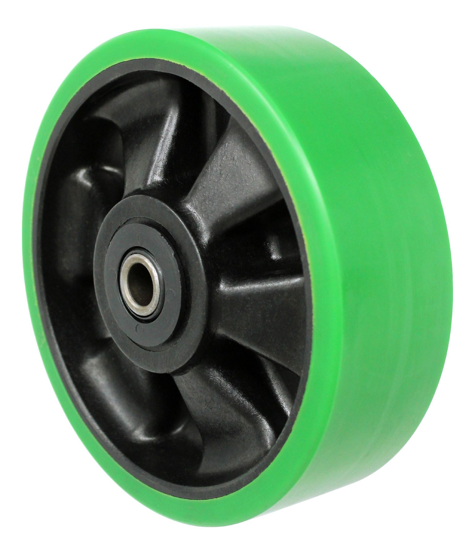 The UG Green Polyurethane on Glass-Filled Nylon Wheel delivers industrial-grade performance with a liquid-cast, non-marking polyurethane tire chemically bonded to a corrosion-resistant glass-filled nylon core, ensuring exceptional durability and smooth, effortless rolling. Available in 4”, 5”, 6”, or 8” diameters with a Shore 95A durometer, it supports up to 1200 lbs for 6” and 8” sizes, making it ideal for food processing, hospitals, schools, and retail where hygiene and floor protection are critical. Resistant to water, oil, grease, solvents, and chemicals, this wheel excels in mildly wet environments and offers superior flat-spot resistance compared to standard polyurethane, providing reliable, low-maintenance operation from -20°F to 180°F for a wide range of institutional and light-duty industrial applications.