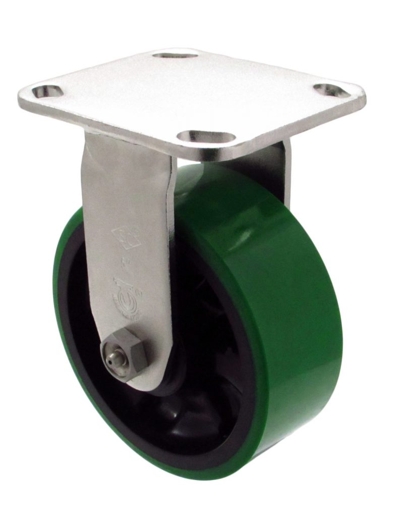 8″ Polyurethane on Glass-Filled Nylon Wheel. Shown in photo with 6″ x 2″ wheel. This stainless steel model 9 rigid caster is made from 304 stamped stainless steel and stands up to corrosive environments well, especially suitable for washdowns due to having a simple design. The mounting plate and legs of the caster are ยผโ thick 304 stainless steel. This caster is ROHS and NSF compliant. Stainless steel Plate Rigid Caster Model 9 is completed with a 1/2โ axle bolt. Rigid casters are most commonly selected when price is a factor, or if you need to travel in a straight line over long distances. This Stainless Steel Model 9 caster performs best if you limit the load to no more than 1200 lbs per rigid.
