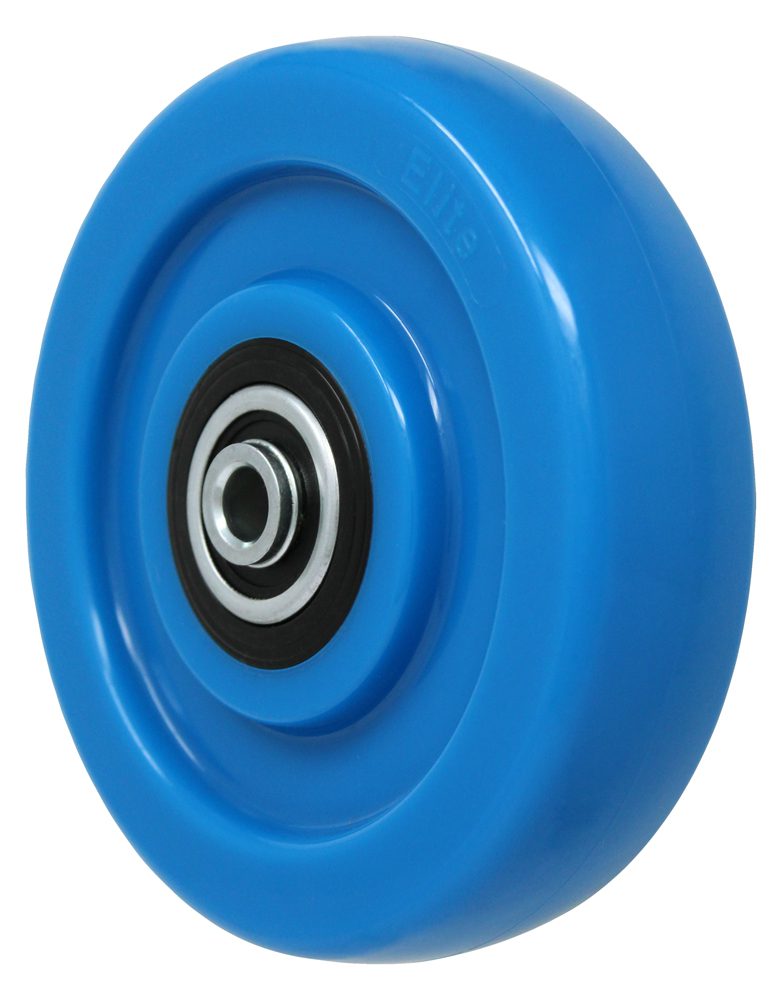 The ET5x1.25PS Elite wheel combines a solid polyolefin core that’s fully encased in polyurethane, providing superior performance characteristics for institutional applications. The 5-inch diameter by 1.25-inch wide design features dual ball bearings for smooth, maintenance-free operation. With a Shore D 65 durometer rating, this wheel offers an ideal balance of durability and floor protection. When under load, the polyurethane tread provides moderate deflection while maintaining its shape, making it suitable for applications requiring both load capacity and floor preservation. However, like all polyurethane wheels, if loads exceed 60% of the rated capacity and remain stationary for extended periods, flat-spotting may occur. The mechanical bonding of the polyurethane to the polyolefin core ensures long-term durability and resistance to tread separation.