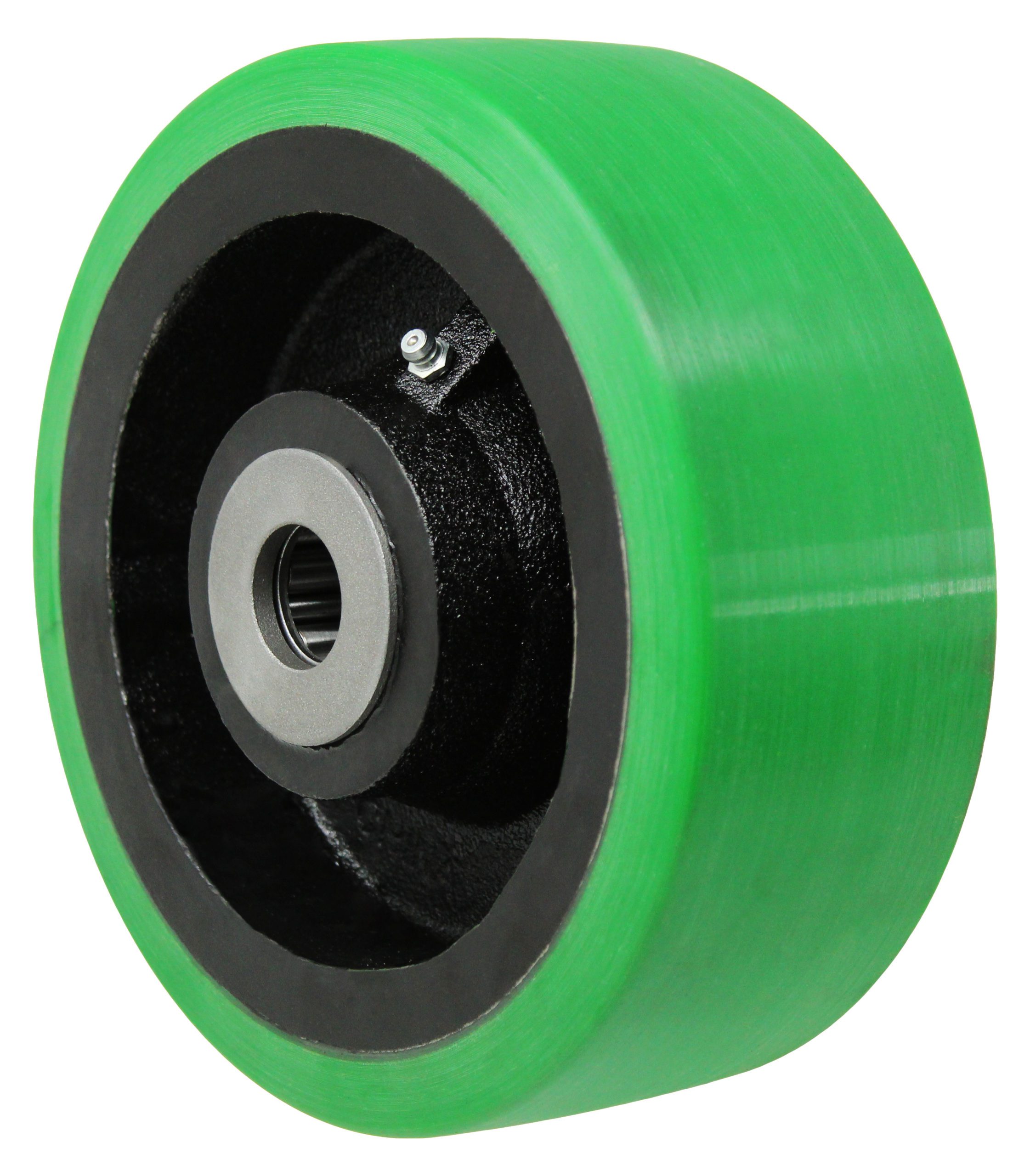 The PYH wheel’s green polyurethane tire, combined with its heavy iron center, ensures durability and the ability to withstand arduous industrial environments. It offers a variety of bearing options, with tapered roller bearings as standard, and sealed precision ball bearings or roller bearings also available to optimize performance across different applications. The thicker tire enhances the wheel’s capacity to carry heavy loads and endure more abuse than comparable polyurethane wheels, making it an excellent choice for manufacturing, warehousing, or other high-demand settings where reliability is critical.
