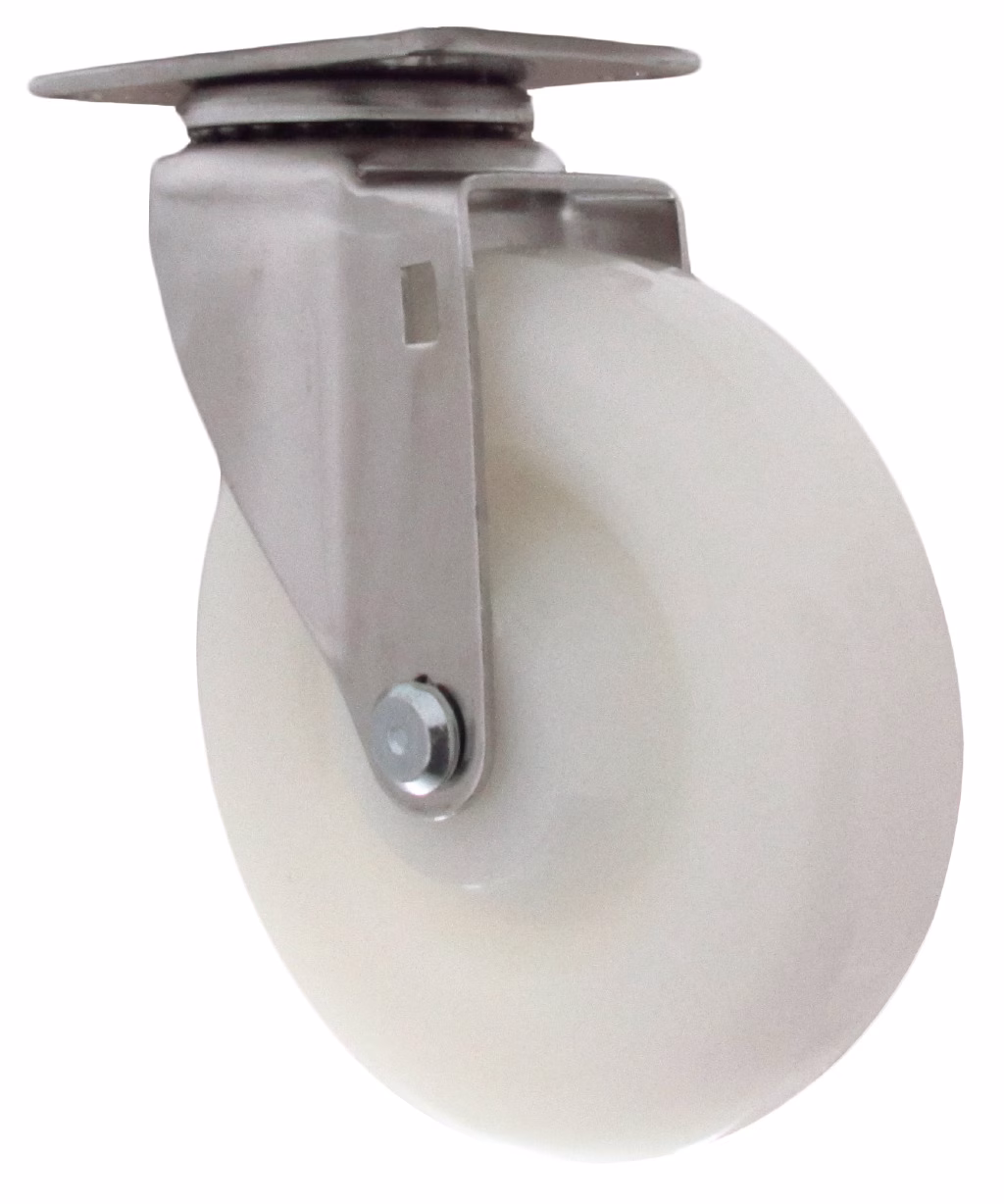 It’s a swivel plate caster with a non-marking nylon 6 wheel (slight crown tread) and an economy stainless steel caster bracket. It comes with Delrin bearings (D) or stainless steel precision sealed ball bearings (SPS), 1.25″ tread width, 3″ to 5″ diameters, and a 350 lbs capacity. NSF-rated and washable, it’s perfect for sanitary settings like food processing plants, hospitals, or pharmaceutical labs, with no flat spotting.