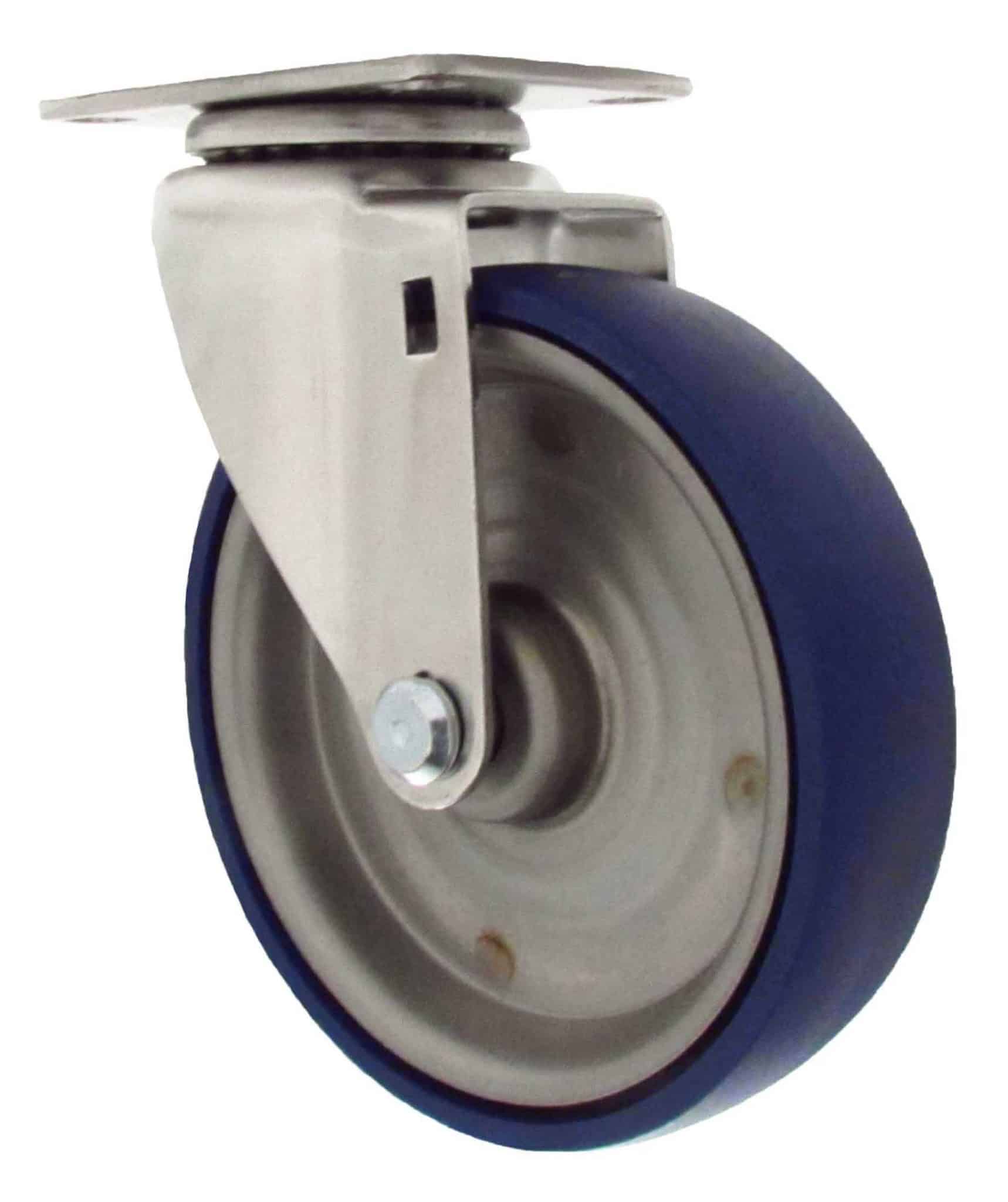 Economy stainless steel casters like the SS-K3 are great for material handling in sanitary settings because they’re cost-effective and built for washdown environments with a drain hole to prevent water buildup. The US – Welded Disc Polyurethane Wheel’s durability and resistance to caustic chemicals make it reliable for moving light carts or equipment in test labs hospitals or food plants.