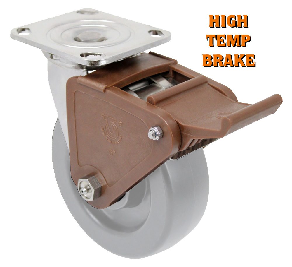 Yes, the Model 9 total lock stainless caster offers a TL – Total Locking Brake option, with the pedal behind the wheel to lock both swivel and wheel rotation. It’s not for holding on inclines, but great for securing in wet or corrosive setups.